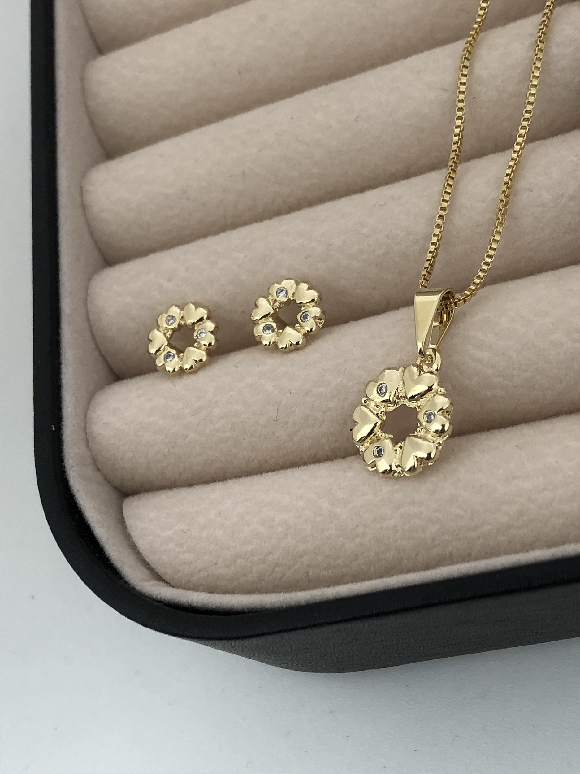 Conjunto colar e brinco, com mini coração com pedra zircônia cravejada.